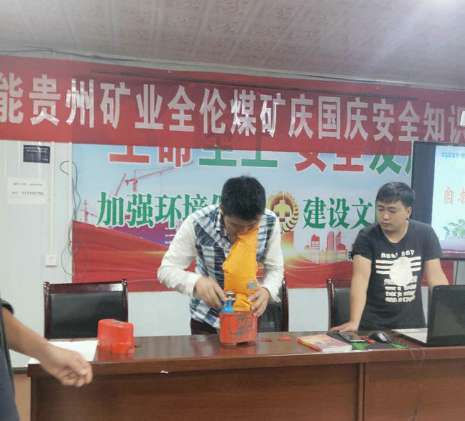 10月4日上午10点,全伦煤矿在职工学习室开展自救器宣传科普知识活动,安监部业务骨干张艳林正在给职工演示ZYX45隔绝式压缩氧气自救器佩戴及使用方法。